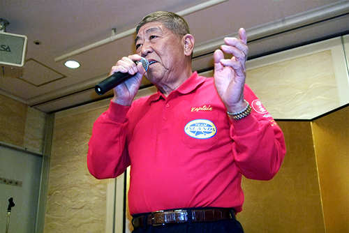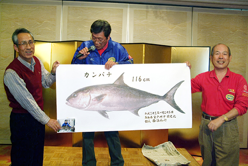 宴たけなわ中、2011年度の大捕り物、カンパチの 魚拓を披露、誇らしげに自慢する西谷和行さん |