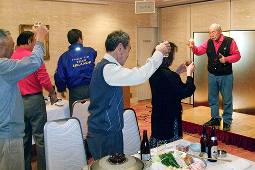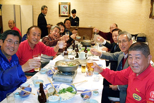 続いて細谷和彦顧問の音頭で 乾杯をするメンバー一同 |