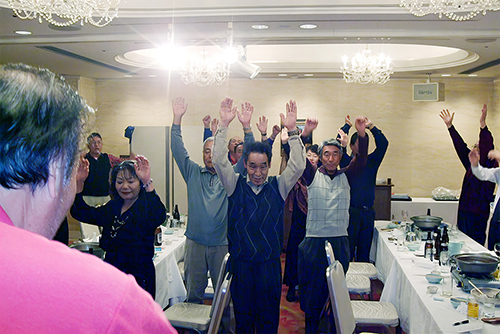 西本正義副会長の中締めで万歳三唱 来年度もご健釣にて頑張ろうと気勢を上げた |