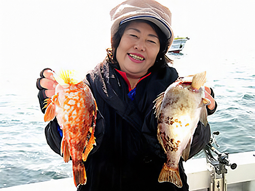 恵美ちゃん、船酔いしながら良型ガシラとメバル、同時ゲット