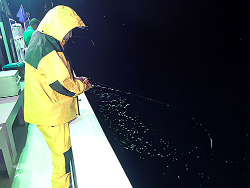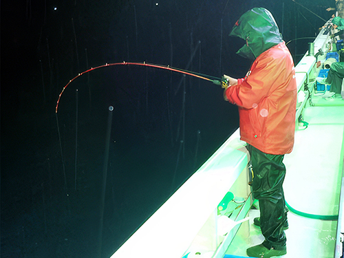 西岡さん、雨降る船上で レインコート着用、2時間後にやっと乗ったイカ
