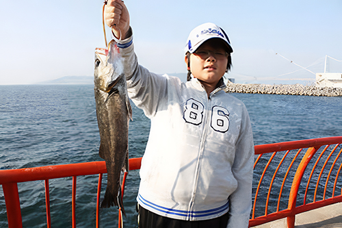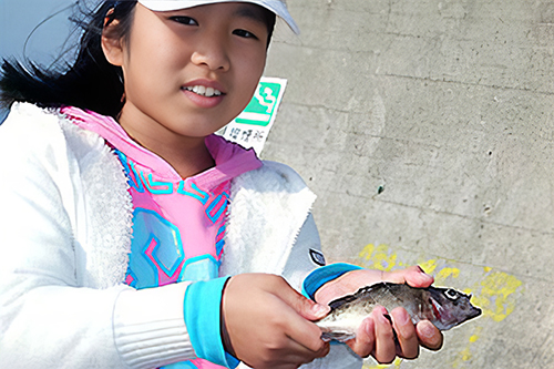 初めて釣ったメバルに嬉しそうな西落合小学校4年生の吉田朱里チャン