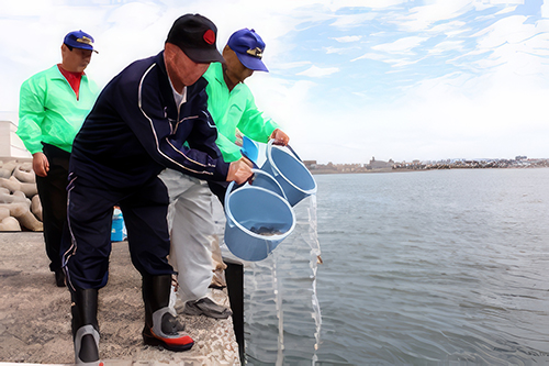 先端に稚魚を放流するフタミ釣りエサセンター新井さんとメンバー