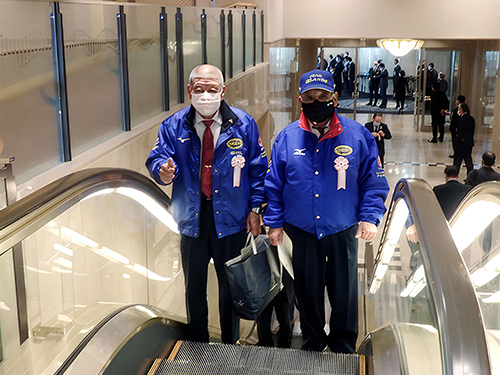 ![]() 入場受付にてセミナー券を提出、党員リボン付けた川田幸正、国元洋正 |