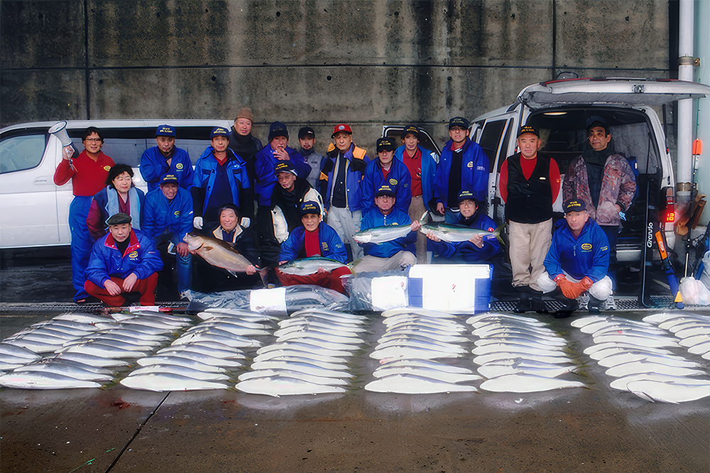 強風荒波の中、参加者全員で釣り上げたメジロの総匹数は、105匹の釣果だった。