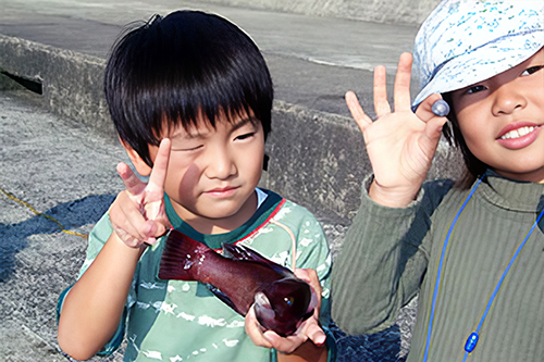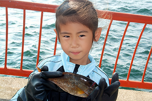初めて釣ったメバルに嬉しそうな西落合小学校4年生の吉田朱里チャン