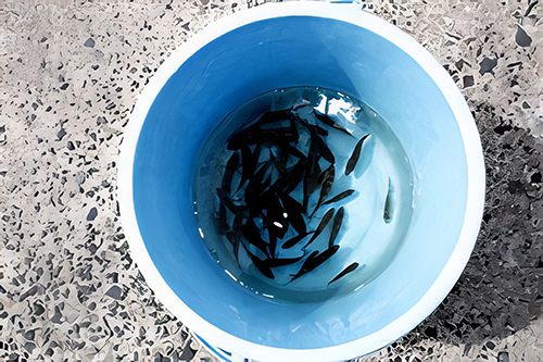 トラックで輸送されてきた5センチほどの元気なクロソイの稚魚