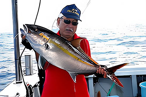 ![]() 良型ヒレナガカンパチ、ゲットに ど〜やと自慢の細谷(朝吉親分) |