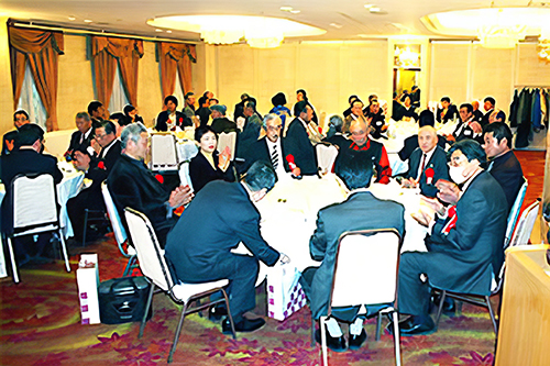 ![]() 面白笑トークで毎年会場を賑せる天理教加古大教会会長 松尾一則さんのご発声で乾杯をすることに |
