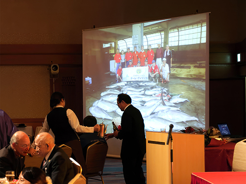 ![]() ご臨席の皆さんに感謝と御礼の言葉を述べ、釣りを楽しむ事のみならず様々な 福祉活動も手掛け交流の絆を大切に会員一同頑張ってまいりますと語る國元会長 |