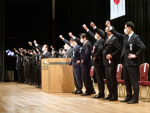 ![]() ご出席者全員揃って万歳三唱を控え、エイエイオー三唱で締める |