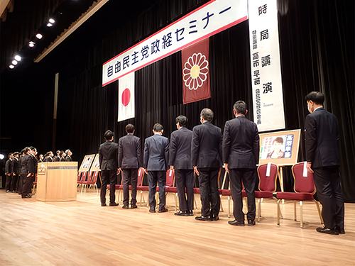 ![]() 勢揃いした各議員団の皆さんが紹介された後、国旗 自民章へ向かい国家黙唱 |